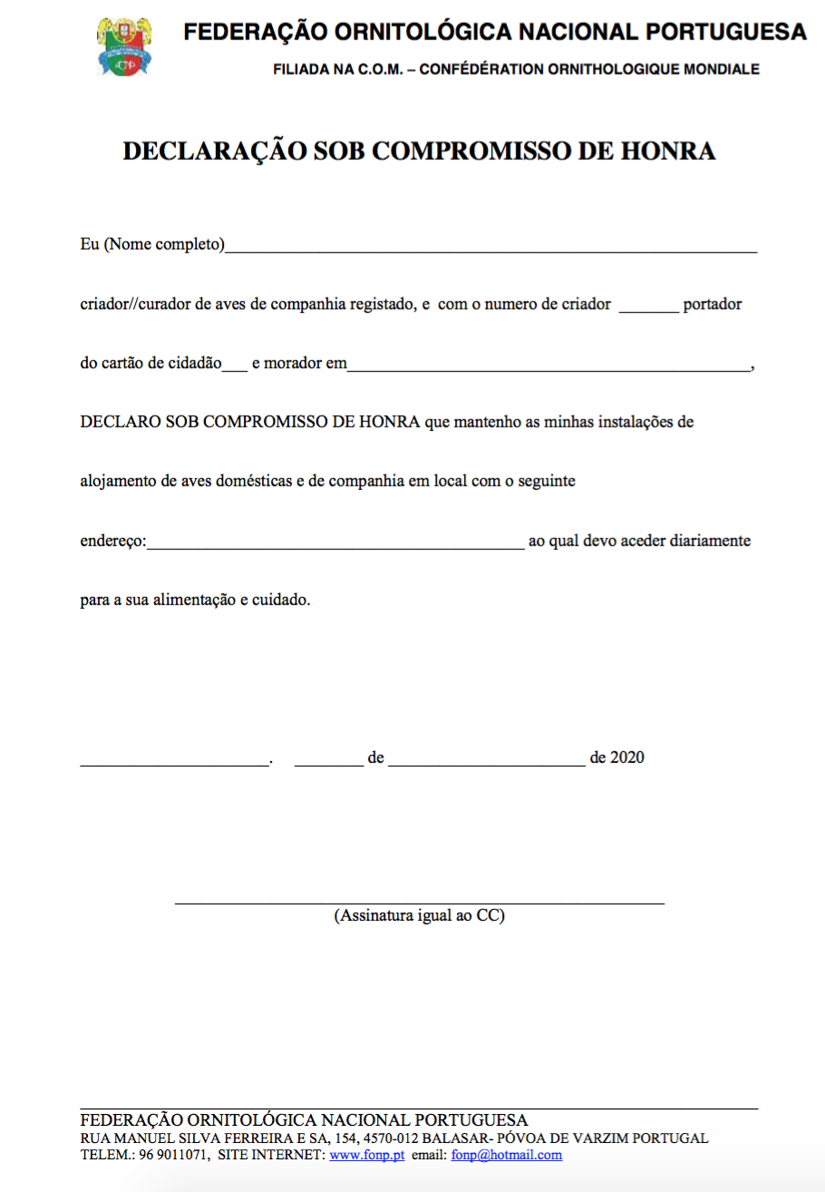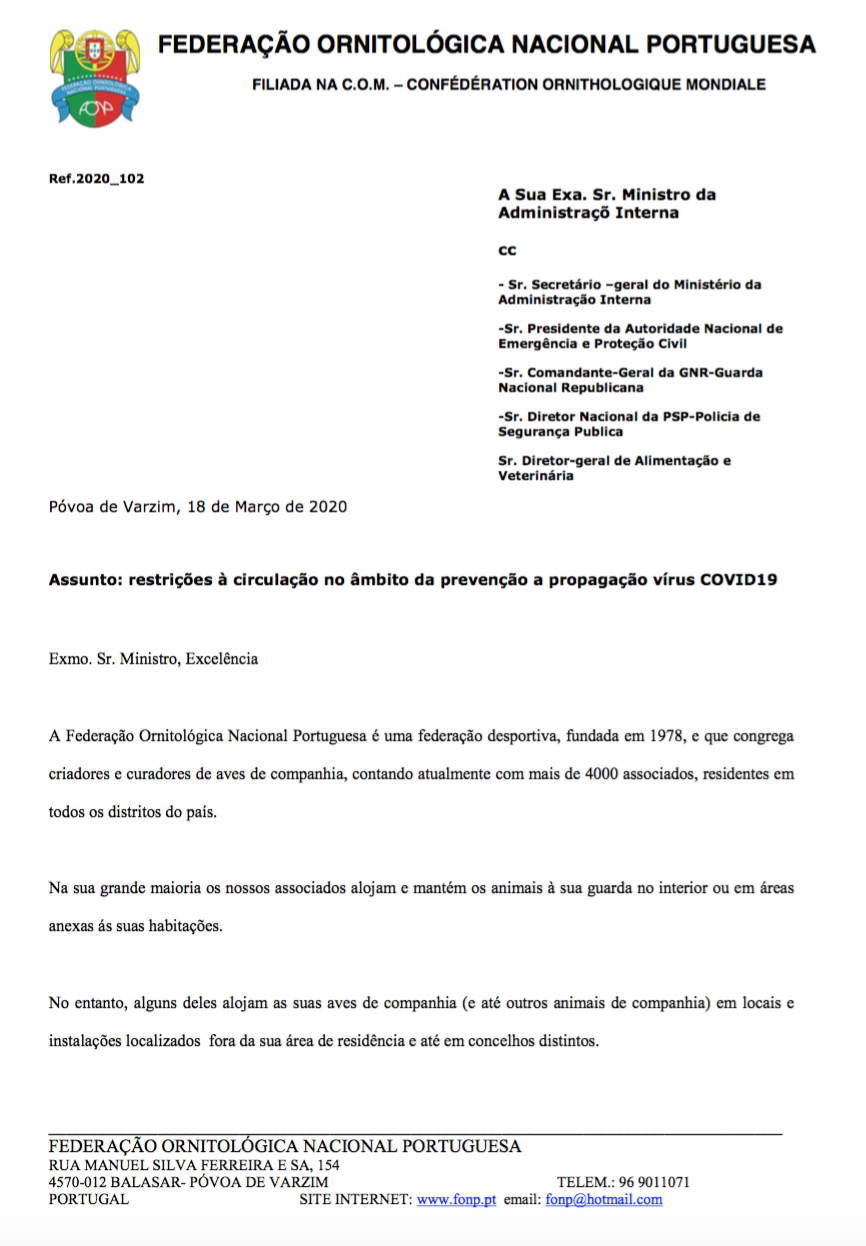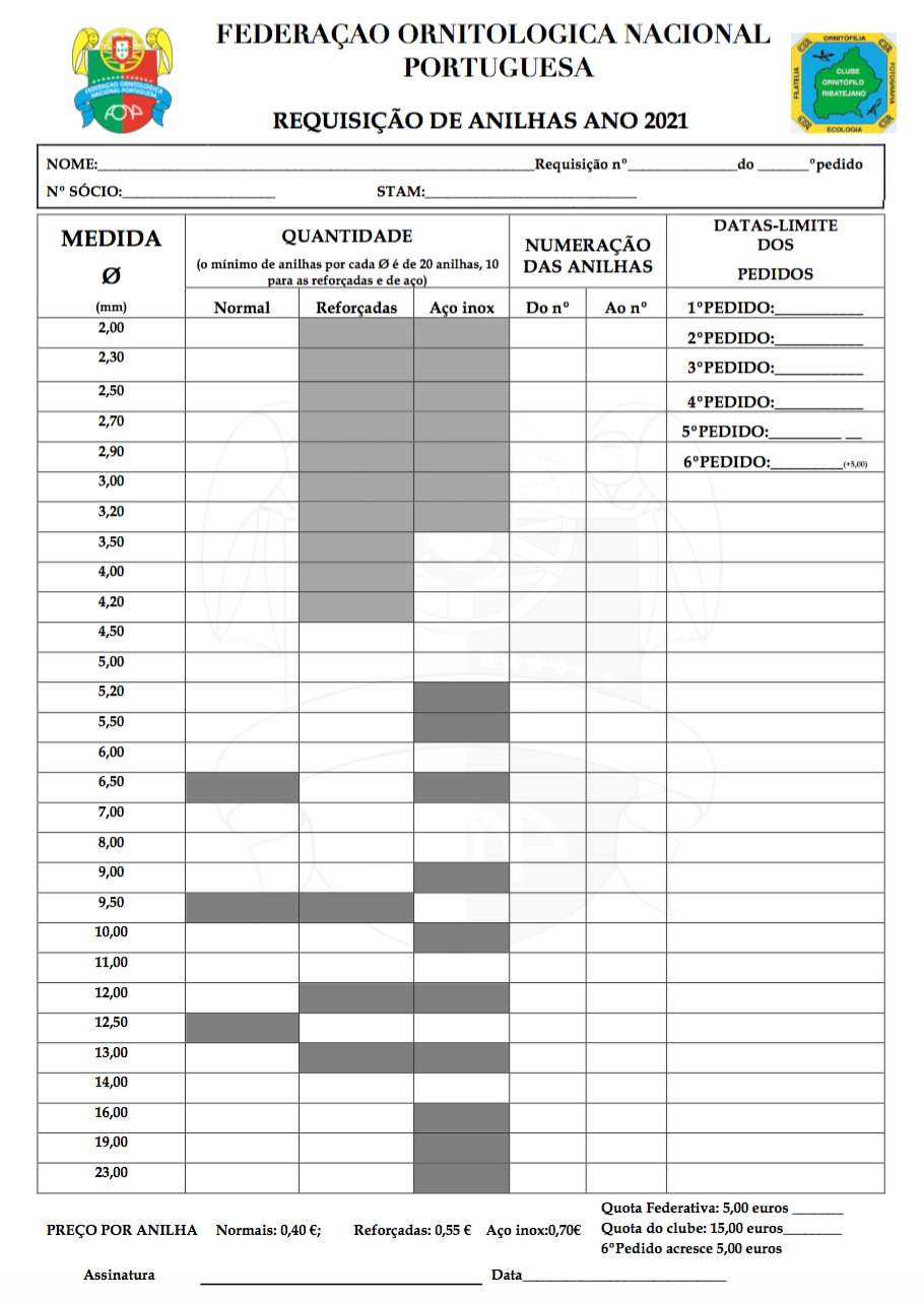 Saiba mais sobre o C.O.R.Em cumprimento das recomendações da Direção Geral de Saúde e com o intuito de minimizar o impacto do novo Coronavírus COVID-19, a Direção do COR vem por este meio informar a necessidade de promover a alteração de alguns procedimentos. Neste sentido, vimos por este meio solicitar a todos os sócios (as) que façam o seu pedido de anilhas para 2021 nas datas correspondentes e indicadas no mapa da Federação, preferencialmente para o e-mail do Clube: clubeornitofiloribatejano@gmail.com, ou através de telemóvel junto de qualquer elemento da Direção, utilizando como meio de pagamento a TB, para o NIB: 0035 0282 0001 1180 3302 8. Pedimos desculpa pelo incómodo e esperamos retomar o funcionamento normal o mais breve possível.